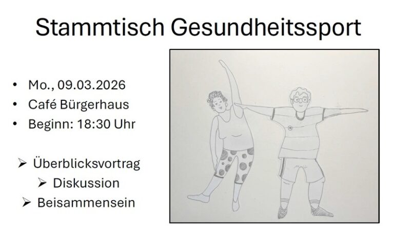 Liebe Mitglieder, Freunde, Helfer und Förderer des Ballsportvereins, ich lade euch zur ersten Ausgabe des Stammtischs Gesundheitssport am Montag, 09.03.2026, mit Beginn 18:30 Uhr in das Café des Bürgerhauses ein. Euch erwartet ein Vortrag, der…